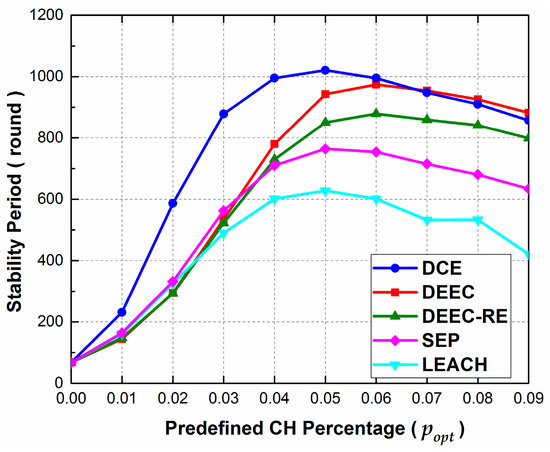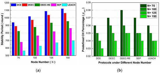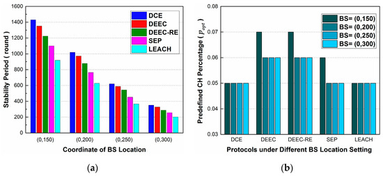 Since the predefined CH percentage directly affects stability period, it is significant to choose proper value of before executing the protocols. In the next subsection, we investigate the effects of node number and BS location on and stability period.