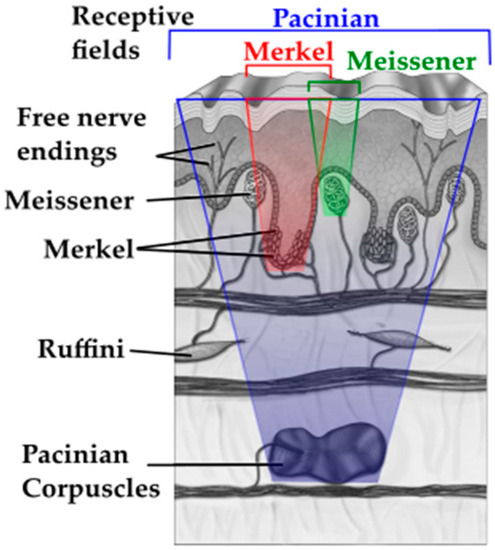 Human skin mechanoreceptors, adapted from [32]; Pacinian corpuscle receptive field in blue; Merkel receptive field in red; and the Meissner receptive field in green.