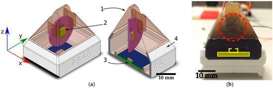 (a) Tactile module: 1, pyramidal compliant structure; 2, MARG system on printed circuit board (PCB), the MARG system land grid array package is highlighted in yellow; 3, deep pressure sensor (barometer ventilation window); and 4, supporting collar. (b) Front view of the tactile probe: the MARG system is embedded under the red circle; the pressure sensor is under the yellow overlay in the black 3D printed collar. A side view of the module can be seen in Figure 3a.