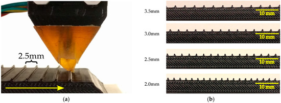 In the first setup, the module is fixed over a linear motion setup. The purpose of this setup is to evaluate the sensors and compliant structure’s response to regularly spaced ridges on a surface while keeping the module in a steady orientation relative to the grating pattern surface. The tactile module is mounted above a linear motion actuator carriage where gratings with different patterns are fixed to stimulate the tactile module deforming its fingertip while sliding under it. Figure 3a shows a close-up view of the tactile module and the 2.5 mm groove width grating pattern in the beginning of the stimulation. The sliding motion occurs along the sensor’s x-axis. The fingertip is slightly deformed due to the contact with the first ridge. Figure 3b shows the grating patterns with a groove width varying from 3.5 mm to 2.0 mm. The depth of the grooves is 1 mm and the thickness of the ridges is 0.6 mm. The grating pattern with 3.5 mm groove width has 20 ridges; the ones with 3.0 mm, 2.5 mm, and 2.0 mm groove have 23, 26 and 31 ridges, respectively. The length of the 3D printed grating patterns is 100 mm. The height of the layers in the 3D printed patterns is 0.1 mm. To minimize the impact on measurements, the layers were deposited such that the module did not cross layers during the exploratory movement.