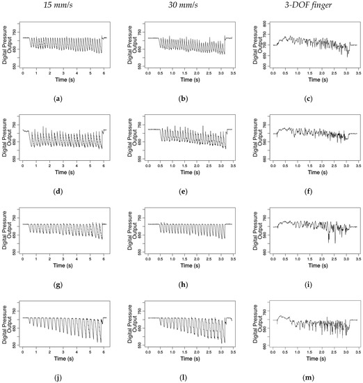 Well-structured setups as the linear motion presented here and in [4,39] are useful to validate and analyze the feasibility of application for tactile sensors, but the assumptions of constant velocity, of constant pressure (or regular increments in pressure) as well as of constant orientation of the sensing apparatus limit the applicability of such sensors in more elaborated robotic applications. The third column of Figure 5 illustrates a scenario closer to real-world applications. The last link of the 3-DOF robotic finger was not constrained to have constant orientation, velocity or pressure. This is the case of almost all real situations involving the exploration of unknown surfaces by autonomous robots. The only constrain in the prerecorded trajectory was the uninterrupted contact between fingertip and grating pattern. As one can notice in the last column of Figure 5, different from the linear motion setup, the data collected by the 3-DOF finger did not present noticeable valleys in pressure. This is due to the changes in orientation and velocity of the fingertip as well as to the variations in force exerted by the fingertip along the movement. Localized features in the collected signals can still be used as discriminative inputs for classification systems.
