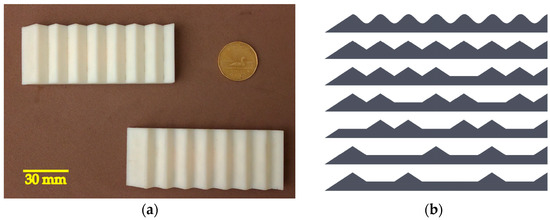 3D printed shapes: (a) Shape 2 on the top and Shape 1 on the bottom; and (b) list of shapes from Shape 1 on the top to Shape 7 on the bottom.