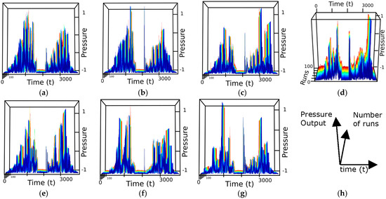 The graphs in Figure 8 show for example the normalized pressure data for each shape. The vertical axes represent the pressure level (Figure 8h), the horizontal axis the discrete time, varying for 0 to 3800 and the number of sample varying from 0 to 100 is shown over the depth dimension. Figure 8d is presented under a slightly different viewpoint to emphasize the number of runs collected.