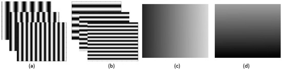 Phase target. (a) Vertical fringe patterns; (b) horizontal fringe patterns; (c) vertical phase map; (d) horizontal phase map.