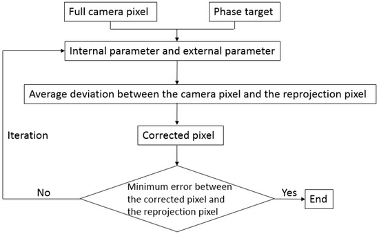 This paper proposes a novel camera calibration method with an iterative distortion compensation algorithm. Full-field camera pixels and the corresponding points on a phase target are used to calculate calibration parameters. The deviation caused by distortion between the real pixel and the reprojection pixel based on a linear projection can be obtained. A corrected coordinate for the pixel can be obtained by compensating the deviation. By using the Levenberg–Marquardt algorithm, the calibration parameters are iteratively optimized by minimizing the difference between the corrected coordinate and the reprojection pixel. To enhance the location accuracy of the world coordinates, fitting techniques and the feasibility of the window size applied to the phase target have been presented to compensate for any phase error.