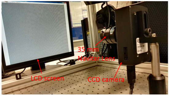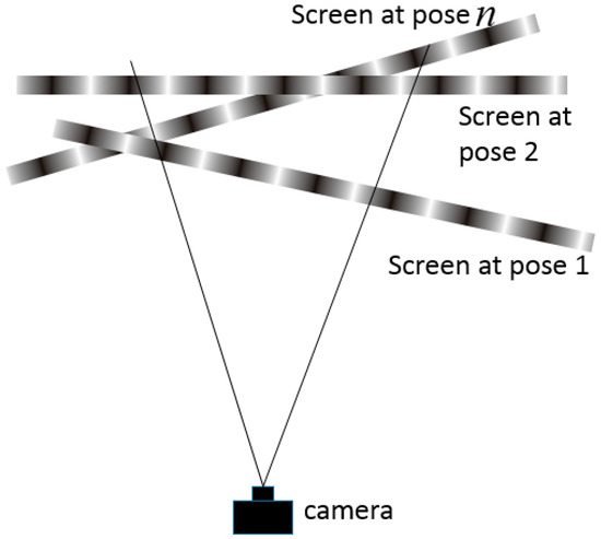 The proposed camera calibration process is illustrated in Figure 2. Two groups of orthogonal fringe patterns are displayed on a LCD screen in sequence. Images at arbitrary n LCD poses are captured during the whole calibration process, as shown in Figure 3. In terms of each LCD pose, k camera pixels uniformly distributed on a CCD (charge coupled device) plane are selected to calibrate the parameters. The selected pixels can be full pixels or sampled pixels with the same gap in order to enhance calculation speed. The corresponding world coordinates are obtained based on their phase values according to Equations (1) and (2). A linear projection H can be obtained according to Equation (3).