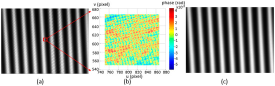 When the phase target is placed in the depth of focus of the camera, an observable deformation on the captured fringe pattern appears as shown in Figure 4a. The deformation comes from the recorded pixel grids on the LCD screen and also the moiré fringe created by the interference between camera pixels and LCD pixels. Taking a small area located at the middle of a calculated phase map, the influence can be seen from the difference between the phase value and its fitting plane, as shown in Figure 4b. In order to enhance the location accuracy of the phase target and guarantee an appropriate input for the following calibration process, a noise compensation algorithm is researched to refine the phase target. A Gaussian filter can be applied to the captured fringe patterns as the virtual defocusing technique used in [19]. However, it is difficult to determine the size of the filter. A flexible approach to eliminate the influence is to locate the phase target at an out-of-focus position of the camera by moving the target position or adjusting the camera focus, as shown in Figure 4c.