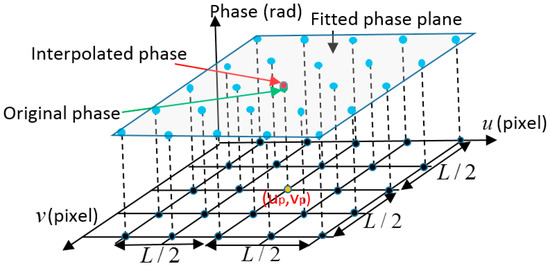 Because the obtained absolute phase map is continuous and smooth, phase data can be smoothed by applying a fitting and interpolation method as shown in Figure 5. For a camera pixel as the yellow dot shown in Figure 5, its original phase is represented as the green dot shown in Figure 5. Near the point on the phase surface, there is only a small difference between the phase surface and the tangent plane. Therefore a phase plane (such as the French grey plane shown in Figure 5) can be fitted with the phase values (the blue dots) of the neighboring L/2 pixels using the least square algorithm. Based on the fitted plane, an interpolated phase value (the red dot) can be calculated by smoothing the original phase according to the fitted plane based on cubic polynomial interpolation. Using a bigger fitting window (L) is more effective to remove errors and to enhance the accuracy of phase data. However based on Equations (1)–(3), the relationship between the obtained phase map and camera pixel coordinate can be obtained by Equations (9) and (10), which are not linear equations, so that the captured phase map is a curve surface.