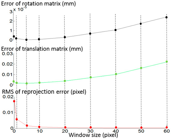 In order to optimize the fitting window size, a simulation experiment has been conducted as shown in Figure 6. Random phase error is the only error source in the simulation. Along with the window size increasing from 0 (no fitting and interpolation applied) to 5 pixels, the RMS (root mean square) of the reprojection error decreases dramatically (as shown by the red line). In this process, a reduction also happens in the error of rotation matrix R and the error of translation matrix t (as shown by the black and green lines, respectively). However, when the window size increases from 5 pixels to 60 pixels, though the RMS of the reprojection error decreases from 0.0016 pixels to 0.000172 pixels, the error of the rotation matrix and the translation matrix both increase. The simulation shows that five pixels is an appropriate fitting window size, which can reduce phase noise and not excessively adjust the original phase value.