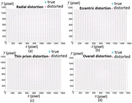 The simulated distortion on the pixel coordinate. (a) Radial distortion ; (b) eccentric distortion; (c) thin prism distortion; (d) the overall distortion caused by radial distortion, eccentric distortion and thin prism distortion.