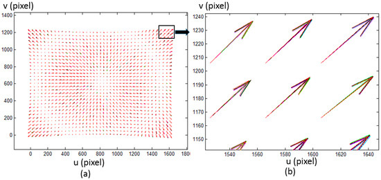 Distortions of the camera pixels in terms of 11 calibration poses, which are distinguished with 11 colors. For the purpose of clear illustration in the figures, only part of the pixels are shown and the vector scales are different. (b) is the magnification of (a).