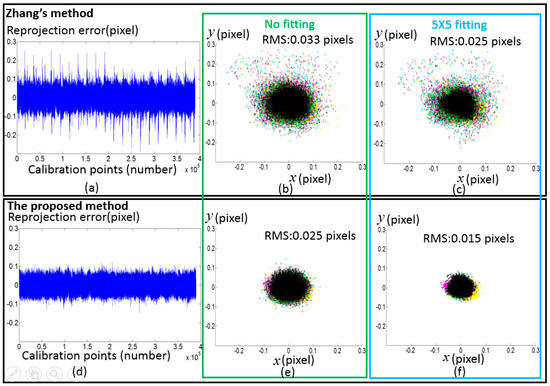 Calibration results with the two calibration approach. (a) Reprojection error of calibration points with the conventional method before using the fitting method; (b) Reprojection error in terms of pixel coordinate with the conventional method before using the fitting method; (c) Reprojection error in terms of pixel coordinates with the conventional method after using the fitting method; (d) Reprojection error of calibration points with the proposed method before using the fitting method; (e) Reprojection error in terms of pixel coordinates with the proposed method before using the fitting method; (f) Reprojection error in terms of pixel coordinates with the proposed method after using the fitting method; Different calibration poses are distinguished with 11 colors.