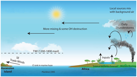 Ascension Island, situated in the mid-Atlantic just south of the Equator (8° South) (Figure 1), approximately 1500 km from Africa, is ideally located. At sea level, the SE Trade Winds are in the South Atlantic marine boundary layer. The Trade Winds themselves are almost invariant, derived from the deep South Atlantic and with little contact with Africa. Above the TWI at about 1200 m–2000 m above sea level (depending on seasonal meteorology and diurnal cycle), the air masses are very different, of equatorial origin; see Figure 2. Dominantly, they have been last in contact with the ground in tropical Africa, but at times from South America. In detail, depending on season, air above the TWI is sourced mainly from tropical and southern Africa with some inputs of air also from southern tropical South America. African and South American methane sources are major contributors to the global methane budget [3,35], but although local campaign studies have been made, these emissions are not well known in bulk. Understanding the changing greenhouse gas burden of the atmosphere demands sustained long-term measurement. Ascension is ideal for this, both in location and in security of access.