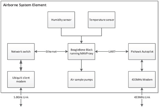 Onboard computing: An onboard computer was required to store and forward the analogue and digital data from the onboard sensing, as well as control the sample collection pumps. This enables the ground operators to see the sensor data in real time for decision making in flight. MAVProxy software was installed for forwarding the telemetry data, and a custom module was written to allow integrated monitoring and control of the payload. All collected data were stored on-board to allow for dropped packets. The architecture of the on-board system components and how they communicate is shown in Figure 4.