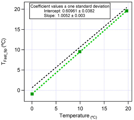 Sensors used in radiosonde measurements were sourced due to having very similar design requirements. The temperature sensor was easy to interface through the onboard computer analogue inputs and proved to be reliable; however, the relative humidity sensor required more attention to integrate due to the limited I2C address range available, and custom addresses had to be programmed ahead of time. The temperature sensor itself was a GE fast-tip FP07 glass bead thermistor (analogue) <0.2-s response time with a spectral response close to 5 Hz (Figure 15 in [37]). Figure 5 shows a three-point calibration for this sensor in a standard Weiss WKL 34/40 calibration oven. The calibration was performed at three set points (0 °C, 10 °C, 20 °C), and the reference was a NIST traceable temperature logger combined with a standard thermistor probe (accurate to ±0.2 °C). Based on this data and in the configuration used, this was found to be accurate to ±1 °C and therefore suitable for the purposes of this campaign.