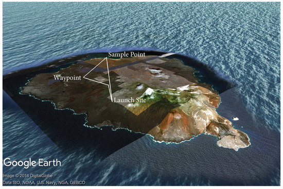 Figure 8. Sample flight path over Ascension Island. - Pre-flight checks, arming the vehicle and manual take-off to 20 m AGL undergoing manual flight checks by the safety pilot.