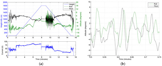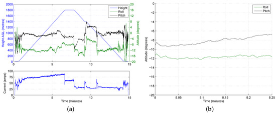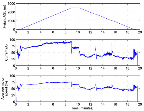 At the start of the campaign, the maximum commanded altitude of the UAV was increased gradually as knowledge and confidence in the system grew. The maximum altitude achieved was 2500 m AGL, which surpassed the required altitude (typical of the local TWI) by approximately 1000 m. Figure 9 shows some of the recorded data for a 2500 m AGL flight. The current drawn from the flight battery illustrates that, as one might expect, the majority of the energy is expended during the ascent. The UAV drew 45 A in the hover at 20 m AGL (370 m ASL) and peaked at 90 A at the top of the ascent, before dropping to just under 70 A whilst hovering at 2500 m AGL. The increase in motor speeds required to hover at 2500 m AGL is also apparent from the bottom of the plots, where the speed to hover at 20 m AGL is compared to at 2500 m. On this particular flight, the UAV landed with of the battery capacity remaining.