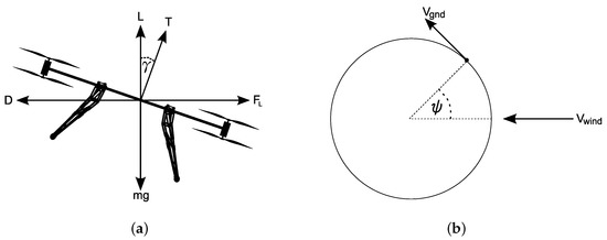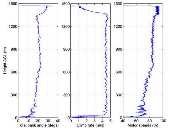 Figure 14 shows how the climb rate remained constant at 4.5 ms until around 1350 m AGL when it was seen to decrease to just 1 ms. The decrease in climb rate was a direct result of the increase in wind speed, which caused the vehicle to pitch and roll to maintain the commanded ground course. The figure also shows the total bank angle of the vehicle during the ascent by taking the magnitude of the roll and pitch angles. The low level strong winds required the aircraft to bank by an average of 20° during the main portion of the climb. At around 1350 m AGL, however, the attitude required to maintain ground course increased to nearer 30° from level, dramatically reducing the available thrust to maintain the desired climb rate. Upon inspection of the motor speeds in the bottom of the figure, it could be reasonably assumed that the flight controller has saturated the motor outputs within the requirements for stability, i.e., the motors are spinning at their maximum speeds. Throughout these high winds, the UAV was still able to maintain an ascent, albeit at a reduced 1 ms.