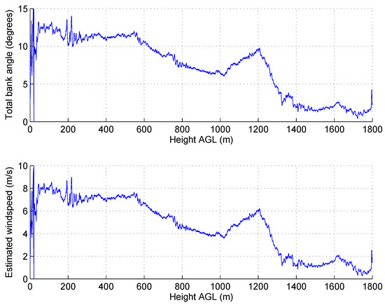 The wind speeds above the TWI were, on some of the days during the campaign, observed to increase rather than decrease, as discussed in Section 7.3. Figure 14 shows flight data collected on such a day, where the wind speed increases significantly at around 1350 m AGL.