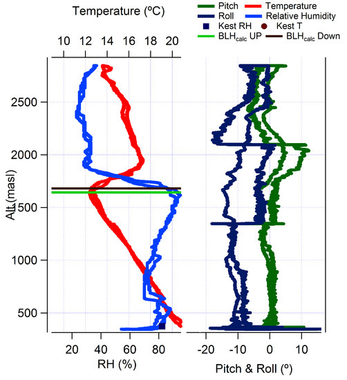 Figure 15 shows a typical flight profile of temperature (red) and humidity (light blue) and also the pitch (green) and roll (dark blue) angles during a flight made on 14 September 2014. A kestrel 4500 weather station under manufacturer’s calibration was operated at the measurement site during each flight day, and these baseline measurements are shown for reference and comparison with the onboard sensors. Pitch and roll angles are included in Figure 15 to enable the reader to identify where the samples are being taken; which in this case corresponds to the two altitudes where there are rapid variations in roll and pitch angles. In this example, the base of the TWI, where temperature begins to rise with altitude, is apparent at 1670 m ASL and marks the top of the turbulently-mixed atmospheric boundary layer below. The inversion zone acts as a cap on the upward motions of the boundary layer. Figure 15 shows the temperature increasing from 12 °C–17 °C over this transition to the unmixed free-troposphere above, and correspondingly, humidity drops from near saturation in the boundary layer to 30 percent at at 1880 m ASL, the top of the TWI. This thickness of 210 m for the inversion (entrainment) zone is at the larger end of inversion thickness observations during both campaigns, with 50 m–70 m being more typical.