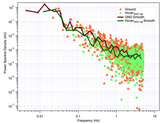 To assess the influence of propeller interference in the sensor response, we contrast power spectra for two periods, one when the Octocopter was stationary on the surface and one when in a hover at 300 m above ground level. Figure 16 shows the raw and smoothed power spectra for each period a −5/3 line is shown for comparison. The propeller rotation rate for the motors and propellers used, Table 1, was between 4050 (50% throttle) and 6250 (100% throttle) rpm, or 67.5–104 Hz. These fundamental frequencies and associated harmonics are not seen in the temperature sensor, which from the spectra in Figure 16 responds up to 2 Hz in our system. There is also no indication that the propellers or the aircraft’s movement during hover influence the temperature signal.