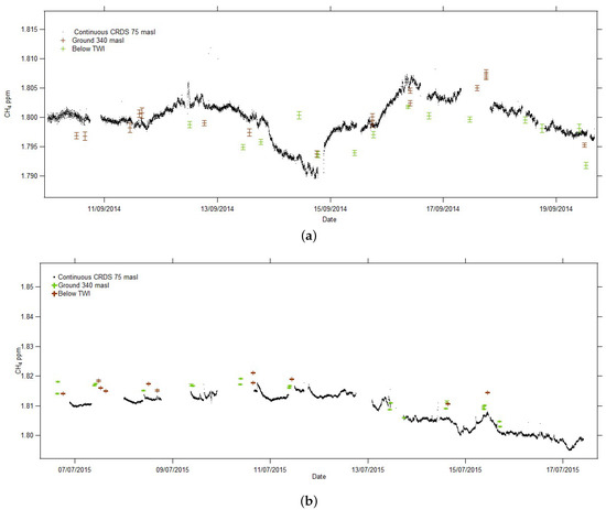 Continuous cavity ring-down spectroscopy (CRDS) CH ground level (75 m ASL) compared with bag samples taken from the ground (340 m ASL) and below the TWI. Date markers are 00:00 UTC. (a) 2014 campaign; (b) 2015 campaign.