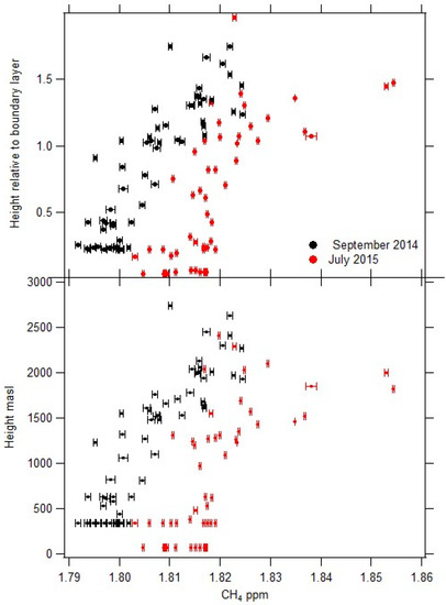 Figure 18 shows the CH mole fraction (ppm) variation with both altitude ASL and relative to the boundary layer for both campaigns. Both the September 2014 and July 2015 campaigns show consistently higher CH mole fractions above the TWI, Figure 18, with increments up to 31 ppb. Mixed source emissions (e.g., wetlands, agriculture and biomass burning) from north of the intertropical convergence zone and Africa may be influencing the air masses. Samples from July 2015 have higher CH mole fractions and ranges compared to September 2014, which is likely to reflect the year on year growth and seasonality [46]. Different mixing ratios across the TWI may also be inferred when comparing the continuous ground level monitoring and samples with CH mole fractions above the TWI [46].