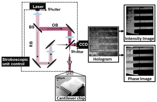 MCSs are often operated in the dynamic mode, i.e., the vibrational response of the device changes upon a recognition event, such as the change of the mechanical property or the mass. For MCSs a recognition event can induce changes in its vibrational amplitude upon the shift in the resonance frequency. In order to measure the amplitude of the out-of-plane vibration of the MCSs, the R-DHM is operated in combination with a stroboscopic control unit. The stroboscopic unit is connected to a piezoelectric actuator (PZA) to externally excite the out-of-plane vibrations of the cantilever. In addition, the stroboscopic unit controls the time synchronization between the positions of the PZA vibration, the ON-time of the stroboscopic source (laser) pulse which is made by the introduction of a shutter in front of the laser and the CCD camera shutter (