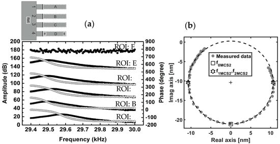 f0MCS4 = 29.4959 kHz). This, in return, suggests that selecting only a small ROI, like region E, at the tip of each MCS is enough for the evaluation of the resonance frequencies. In region F, however, the Bode graph shows only a relative movement with low amplitude and without a resonance peak. We expect such a behavior since this ROI is next to the clamped part of the MCS number 4 cantilever.