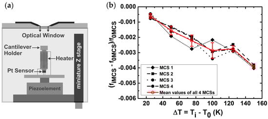 For the MCSs labelled 1–4, the decrease of the resonance frequency upon heating from T0 = 298 K to T = 450 ± 0.1 K is equal to ΔfMCS1 = (f450 K − f298 K)MCS1 = −119.1 ± 0.1 Hz, ΔfMCS2 = (f450 K − f298 K)MCS2 = −113.3 ± 0.1, ΔfMCS3 = (f450 K − f298 K)MCS3 = −118.5 ± 0.1 Hz, and ΔfMCS4 = (f450 K − f298 K)MCS4 = −117.2 ± 0.1 Hz where the subscript number shows the MCS‘s number. Moreover, in these measurements the quality factor shows less than 2% of change when the temperature changes from T0 = 298 K to T = 450 K ± 0.1 K. Therefore, they are not discussed further.