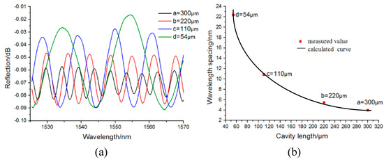 Figure 4a shows the reflection spectra of the proposed pressure sensor under different cavity lengths. Here a, b, c, and d represent the cavity lengths, which were 300 μm, 220 μm, 110 μm, and 54 μm, respectively.