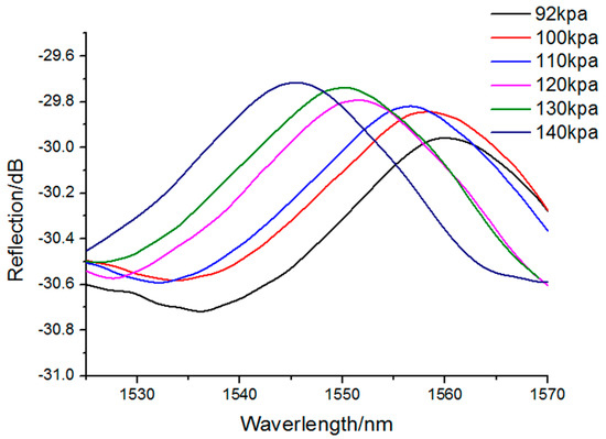 Figure 6, it can be determined that the peak of the reflection spectrum shifts toward to the left with the increase in pressure.