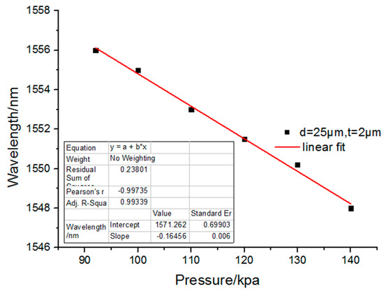 Figure 9 that with the increase of cavity length, the pressure sensitivity decreases significantly. While according to Equation (6), the sensitivity is inversely proportional to the cavity length. In the fitted line, the silica wall thickness is set as 2 μm. The result of this paper agrees with the theoretical model.