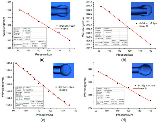 Figure 8. The wall thickness of the four microbubbles were around 2–4 μm. The maximum difference between those four microbubbles was that the cavity length was tuned between 254 and 1454 μm. It seems that with the increase of the cavity length, the corresponding calculated sensitivity vs. pressure were 164.56 pm/kPa, 105.08 pm/kPa, 71 pm/kPa, and 47.58 pm/kPa, respectively. Therefore, with the increase in the length of the cavity, the sensitivity decreases.