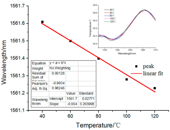 Figure 10 shows the wavelength shift of the fiber pressure sensor under different temperatures. The inset in