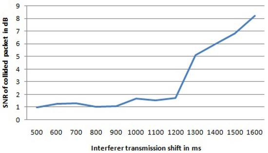 By increasing the delay of the interferer transmission, the average SNR value for the received packets from the interfered transmitter will be increased. For the first four shift values (up to 400 ms), we do not have data for the SNR value because all packets from the interfered transmitter were lost due to collision. For shifts from 500 to 1200 ms, the average SNR value for the received packets stays under 2 dB, while for higher shifts of the interferer transmission, the average SNR value becomes higher. For bigger shifts of the interferer, the collision time becomes shorter, and as consequence, the SNR value of the interfered transmission increases. The graph with the average SNR values for the received packets of interfered transmissions for different shifts of the interferer transmission for the first setting is shown in Figure 4.