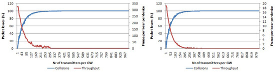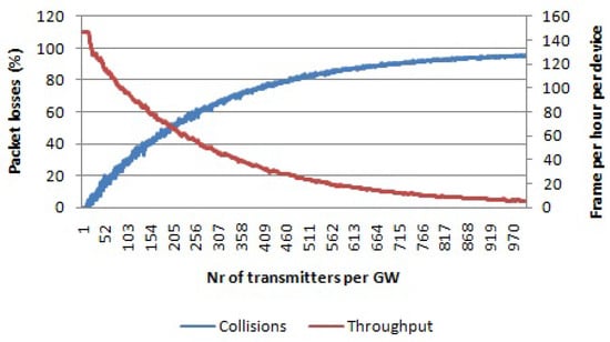 When all non-interfering logical channels in the 868-MHz band are used, then the scalability will further increase. The collision graph using pure Aloha access for multiple channels and multiple SFs is given in Figure 14. For 1000 nodes per gateway, around 90% of packets collide, while the average throughput per device is around 20 frames per hour.
