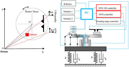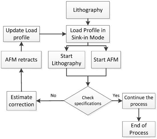 The AFM inspection is carried out by a Nanite AFM scan head with a maximum scan range of XY 110 µm × 22 µm needing standard AFM cantilevers, while for the lithography, a scan head Nanite SH A110 having similar range of measurement as the AFM head is used in front. The AFM is controlled by SPM200 controller while the lithography head is controlled by SPM100 with speeds of up to 60 ms/line. Hence, both heads are independently operated but working under one script when both operations of lithography and in-process are in progress (Figure 6 and Figure 11). The overall control architecture is shown in Figure 6 where the both operation of lithography and inspection are operating in a loop, taking commands from high level control planned by human interface. The sample is controlled in position under the lithography and AFM probes.