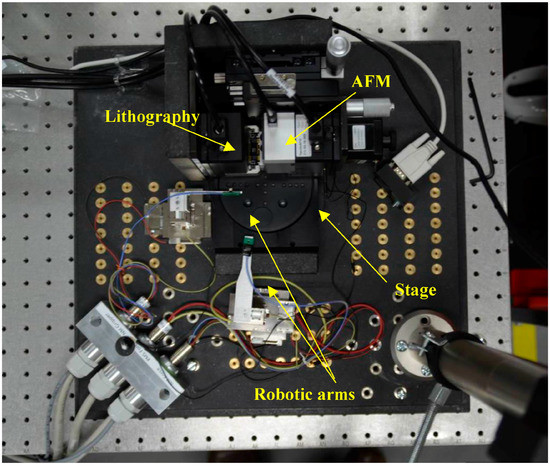 Based on the previous reviews and objectives, we propose a recently developed in-process inspection for nanomachining based on AFM probing system. The host system is a nanomanipulator having one side for sample preparation and robotics manipulation, and, the other side for nanomachining such as nanolithography with in-process inspection (Figure 1). This instrument encompasses nano-manufacturing with in-process inspection, assembly, and inspection/characterization of material particles or parts at the nanoscale. The instrument comprises all operations in one single rotating stage keeping the same datum for the samples that are under investigation. This rotating stage has three zones. The first one is the sample preparation zone. The second one is for samples manipulation and equipped with three robotic arms, each having three degrees of freedom (DOF) with a nanometer resolution over a 10 mm range of motion. This manipulation area is monitored via a CCD camera having a resolution of 1 µm. This can inspect samples and probes. The third zone has the AFM inspection with in-process (i.e., nanomachining) inspection. The nanomachining encompasses numerically controlled nanomachining e.g., lithography with its probe mounted back-to-back to an AFM probe for in-process inspection as a new feature. A suction device is added to clean the on-going machining debris. A top view of the whole instrument is shown in Figure 2. Most parts are homemade except technology hardware e.g., AFM, robotic arms, rotating stage.