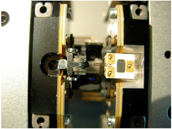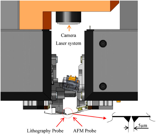 The two AFM and lithography probes are mounted back-to-back with physical distance adjustment set to 5 µm as a security distance to avoid any crash between the probes. The two heads were little modified with covers removed and with little adjustment of the piezoscanner. Only one top view camera will be available for both systems as shown in Figure 4 for positioning. The detailed positions are shown in Figure 4 and Figure 5 where the distance between the probes is 5 µm. The probes can safely move horizontally without crashing against each other. The sample to be tested can be adjusted underneath the probes using one axis of the table.