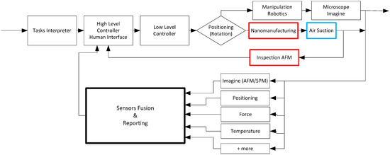 All components are controlled based on the control architecture described in Figure 3. The highlighted colorful controllers are mainly for in-process inspection. Some vibrations can be noticed of the AFM and cutting probes due to an environment minimized by isolating the nanomanipulator from the ground vibration through a controlled damping table.