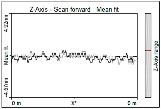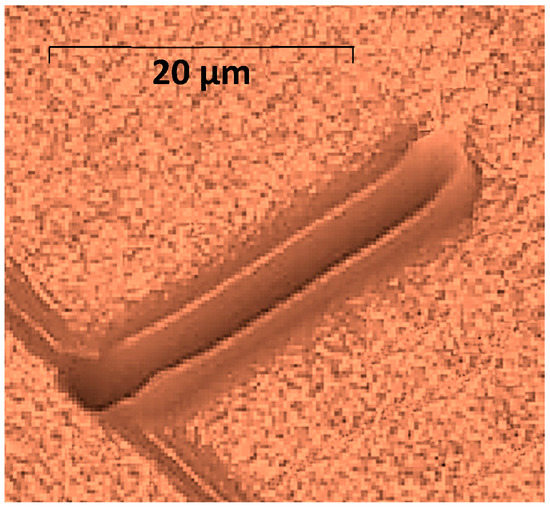An operated linear scratch was carried out on polyimide film with a normal force of 10 µN (Figure 12). The probe had a stiffness of 18.5 N/m with resonant frequency of 220 kHz. The probe length was 110 µm equipped with a Si tip having apex radius better than 10 nm. The specified depth of scratch was 150 nm but soon it was realized that the depth was at only 135 nm average. This has been corrected automatically towards the remaining 10 µm to 150 nm as it can be shown in Figure 12.
