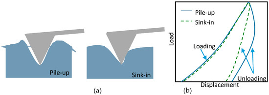 (a) Pile-up and sink-in; (b) load-displacement curves for elastoplastic material and viscoelastic and plastic response on soft material.