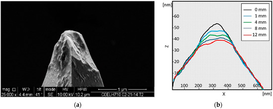 Irrespective of the desired mode described previously, the AFM probe tip will be worn progressively as long as it is in sliding contact with the opposite surface. Wear has been discussed in [12] where the contact radius of the tip can degrade by increasing its radius in two phases; the first one will be very fast with immediate increase of the radius when the tip breaks, the second one takes a longer time depending on the scanned distance. Figure 9a shows an example to probe tip wear with wear rates examples. It is required, depending on the mode of nanomanufacturing, to compensate for this wear and for other misadjustments. Figure 9b shows tip shape degradation after several passes from 1 mm to 12 mm. the initial shape is shown at 0 mm. The wear range can go up to 20 nm for continuous scan over 12 mm pass. The trajectory length used in this paper was less than 1 mm, with very good probability to keep the tips in their initial shapes.