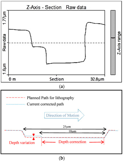 The inspection of the scratch shown in Figure 11 was progressing as the lithography probe was moving by a gap distance of 5 µm as this was the gap when positioning the probes back-to-back. The correction introduced here was triggered when the AFM probe reports the incorrect depth (Figure 13), hence parameters on the lithography can be updated to cut more in-depth by the spotted difference. If it is too late (always by 5 µm at least) because of this gap, then the lithography probe is requested to return to where the defect has been detected and a correction will be then implemented as it is seen in Figure 13a.