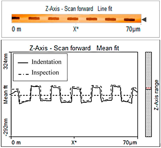 In the next test, a nanolithography process was executed on a series of PMMA material samples in sink-in mode as introduced previously. A series of grooves were indented over 70 µm length with an average depth of 10 nm (Figure 14 top). In-process measurement by AFM probe in tapping mode compared to the probe executing lithography has shown little expected discrepancy (Figure 14 bottom) but is still in good agreement with the initial request.