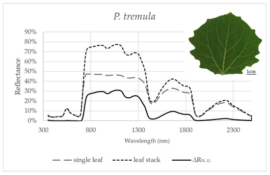 For both tree species, the maximum and the minimum values of ∆R5L–1L were detected in NIR and VIS, respectively. The variance of ∆R5L–1L in NIR was up to two orders higher than in VIS. Measuring the leaf reflectance under a different measurement setup (a single leaf or more leaves in a stack) usually affects the reflectance curve [26]. The reflectance of a leaf stack in NIR was higher about 20–30% than the reflectance of a single leaf as it was shown in the study by [11] when the stack was composed of four or six planar leaves (species not indicated). We confirmed the same effect of the measurement setup in our study using one and five leaves of P. tremula and S. caprea.