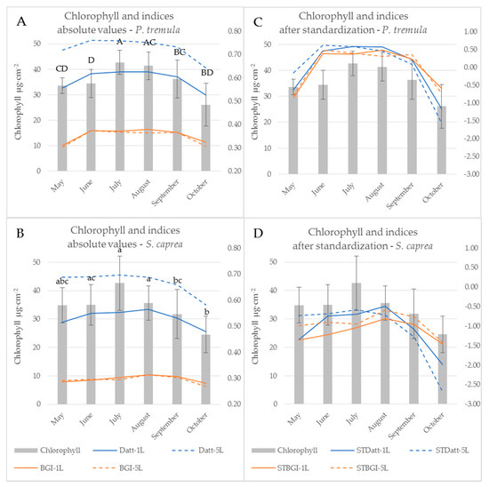 Chlorophyll a + b content of P. tremula (A,C) and S. caprea (B,D) during the vegetative season (bars, left axis) and a seasonal course of selected chlorophyll indices (lines; right axis). Datt is presented as an index affected by the measurement setup, BGI as an index unaffected by the measurement setup. Left graphs (A,B) show absolute values of indices computed from the contact probe reflectance of a single leaf (1L) and a leaf stack (5L). Right graphs (C,D) show identical indices after z-score standardization. Chlorophyll content: different letters above the columns correspond to a significant difference, One-way ANOVA, Tukey–Kramer test. Significant differences if p < 0.05.