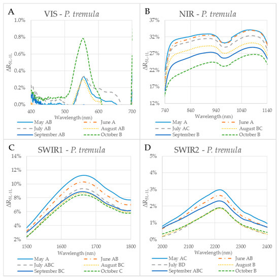 The difference (∆R5L–1L) between the reflectances measured on a leaf stack (5L) and a single leaf (1L) during the vegetative season, represented by curves for 6 months (May–October) for selected spectral ranges in P. tremula. The mean value of ∆R5L–1L for each month from May to October within: (A) VIS (400–700 nm); (B) NIR (740–1140 nm); (C) SWIR1 (1500–1800 nm); and (D) SWIR2 (2000–2400 nm). Different capital letters by months´ names correspond to a significant difference in ∆R5L–1L, computed from the mean reflectance values in the particular spectral range and the month of sampling. One-way ANOVA, Tukey–Kramer test. Significant differences if p < 0.05.