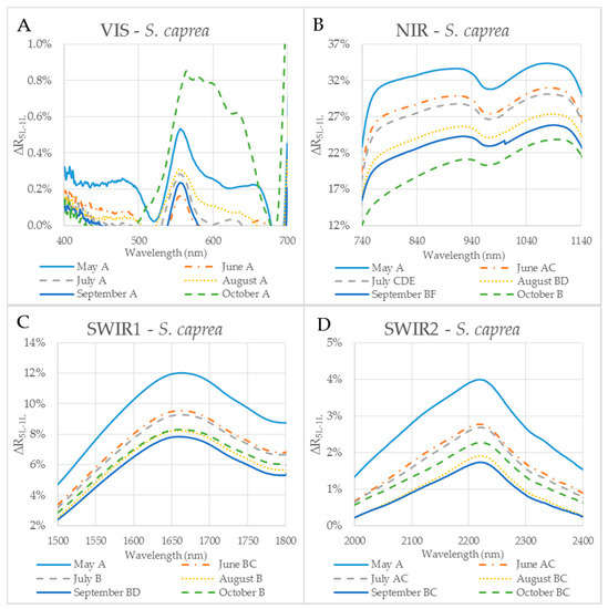 The difference (∆R5L–1L) between the reflectances measured on a leaf stack (5L) and a single leaf (1L) during the vegetative season, represented by curves for 6 months (May–October) for selected spectral ranges in S. caprea. The mean value ∆R5L–1L for each month from May to October within: (A) VIS (400–700 nm), (B) NIR (740–1140 nm) and (C) SWIR1 (1500–1800 nm) and (D) SWIR2 (2000–2400 nm). Different capital letters by months´ names correspond to a significant difference in ∆R5L–1L, computed from the mean reflectance values in the particular spectral range and the month of sampling. One-way ANOVA, Tukey–Kramer test. Significant differences if p < 0.05.